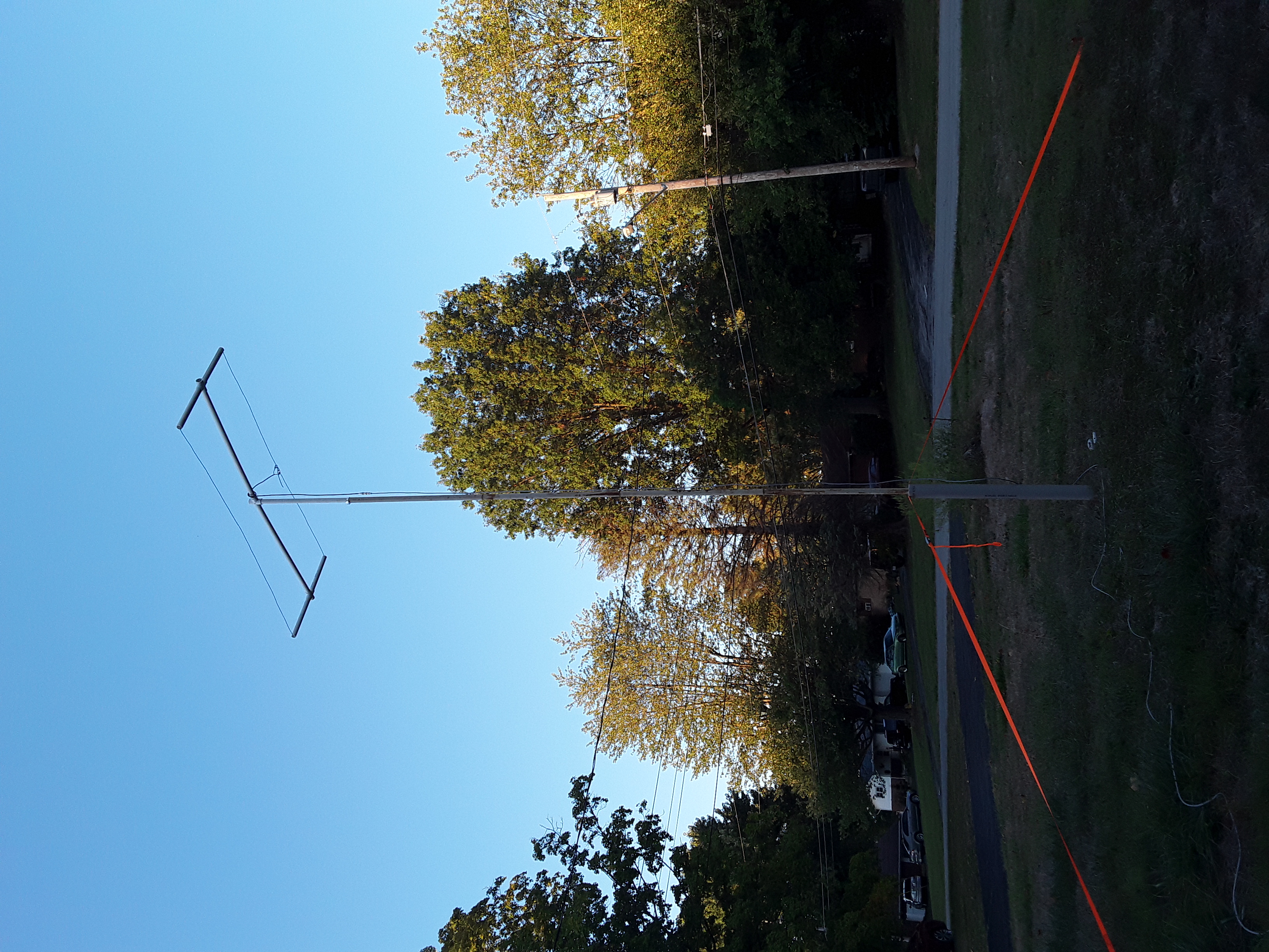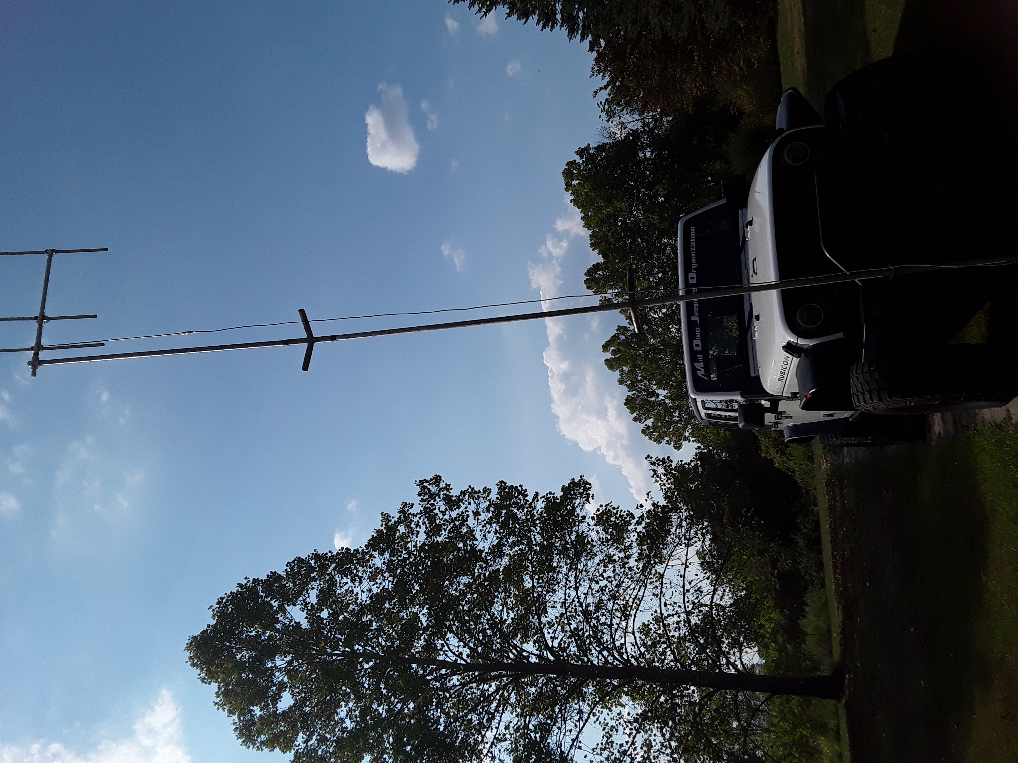 I'll start with my setup for Field Day 2020. For 2020 I decided to host a private field day at my parents' farm. The orange pole is my telescopic pole I'm using for POTA holding an inverted V at the time. The silver poles was a bunch of leftover pop-up tent poles stacked end to end to make about 30 - 40 feet. The sections were only about 4 feet long, supported by tarred bank line that wasn't very thick. These things was floppy and bendy and barely stayed up, but they lasted long enough to hold a 40 meter end fed. We ran on generator power from the tent, complete with campfire and Hobo Pockets for chow. I don't remember how many contacts we made but we were happy. Use what ya got, but stay safe!